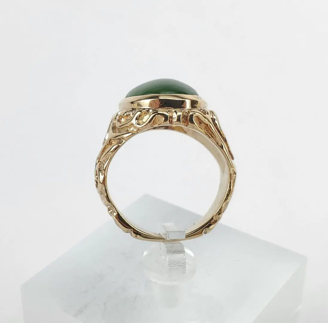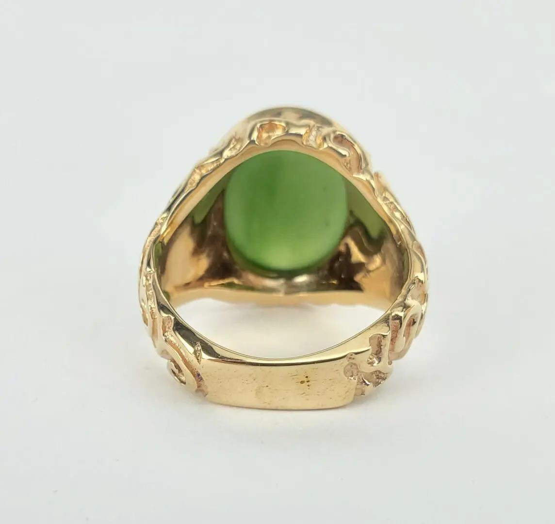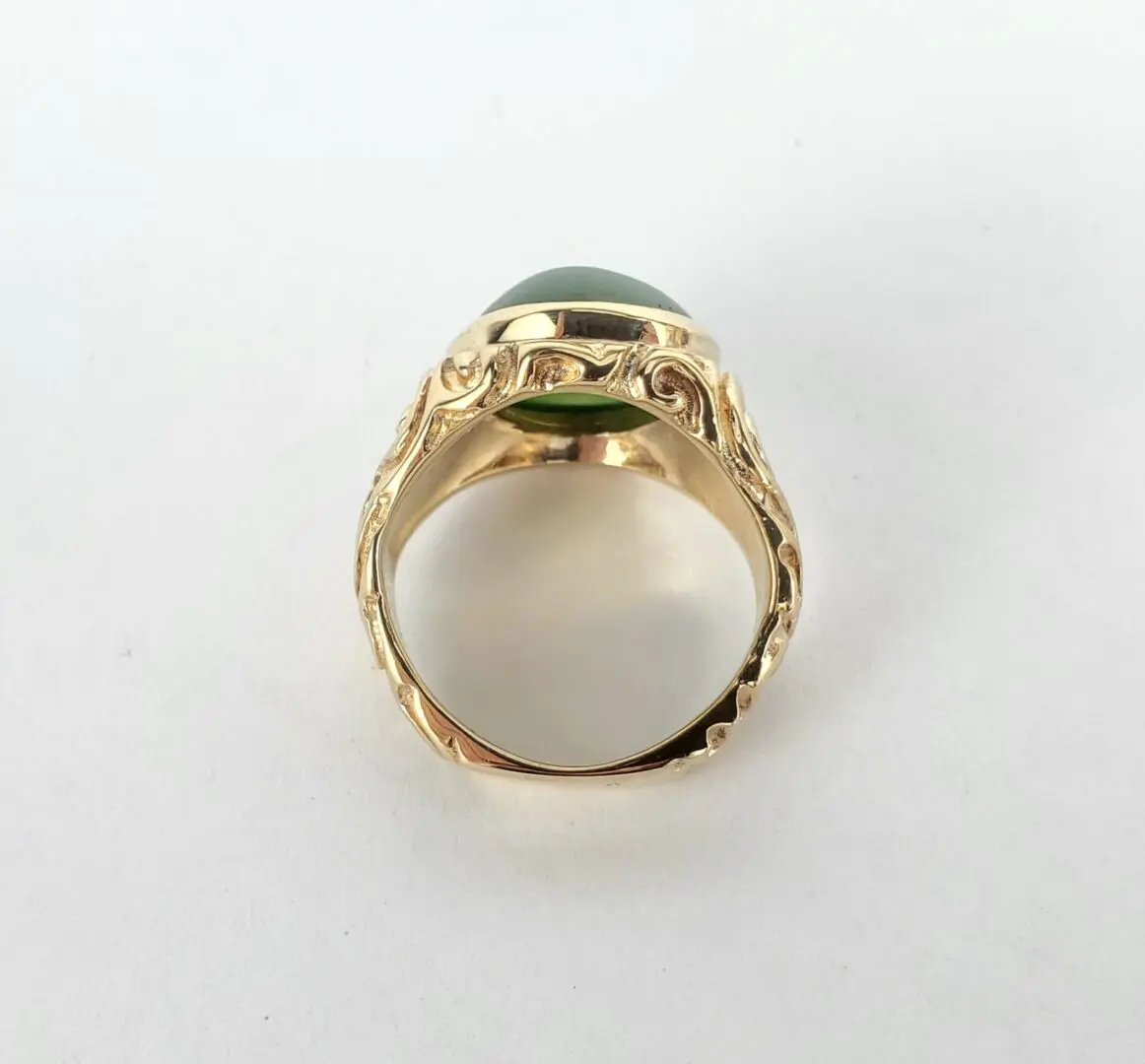 10k Yellow Gold 7ct Oval Cabochon Nephrite Jade Engraved Carved Cocktail Ring