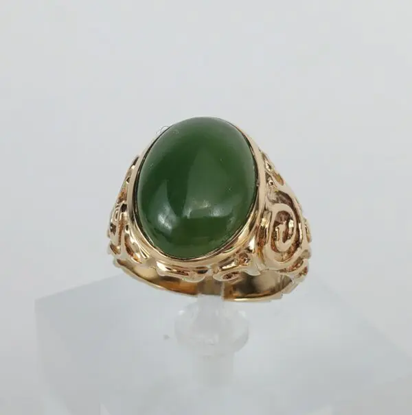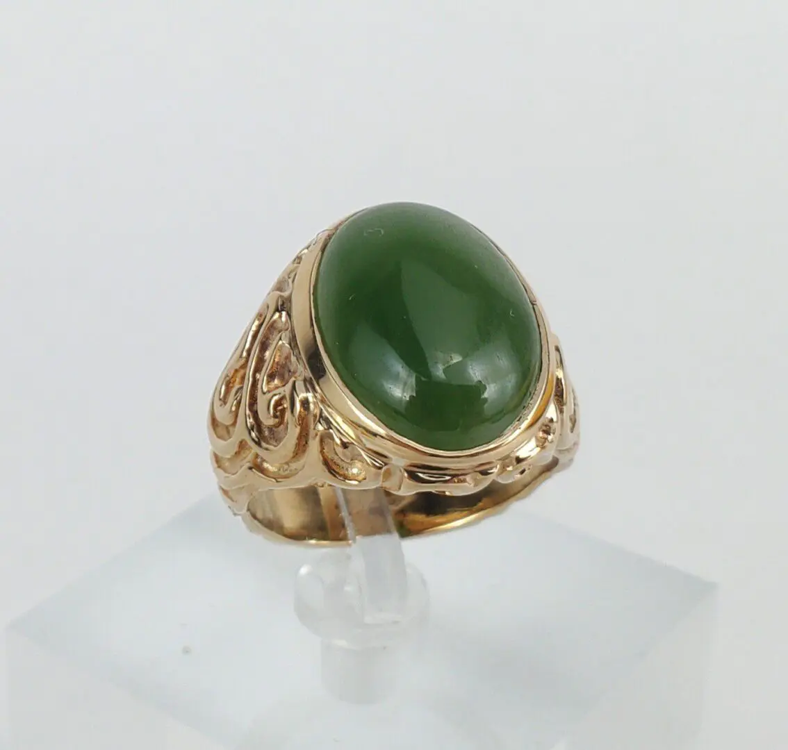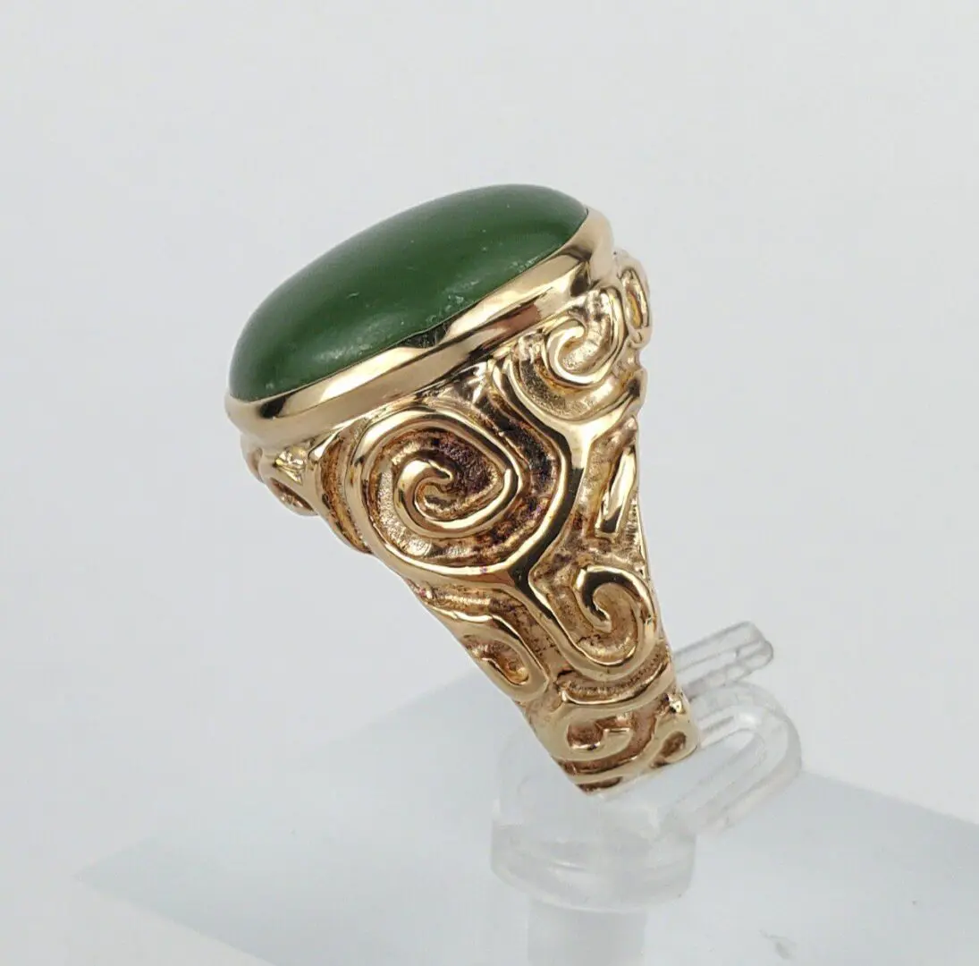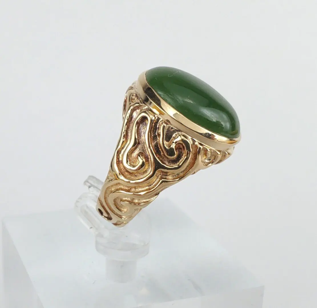 10k Yellow Gold 7ct Oval Cabochon Nephrite Jade Engraved Carved Cocktail Ring