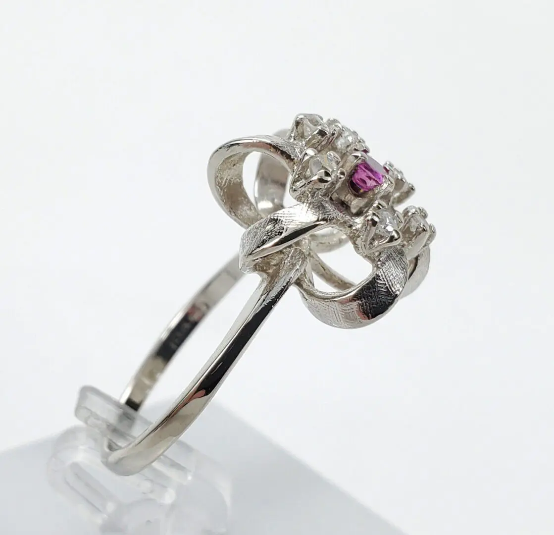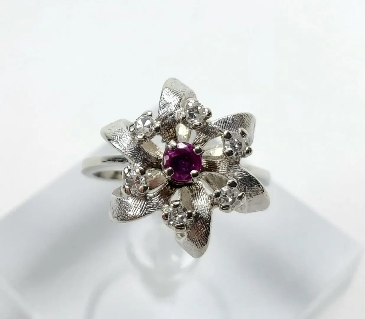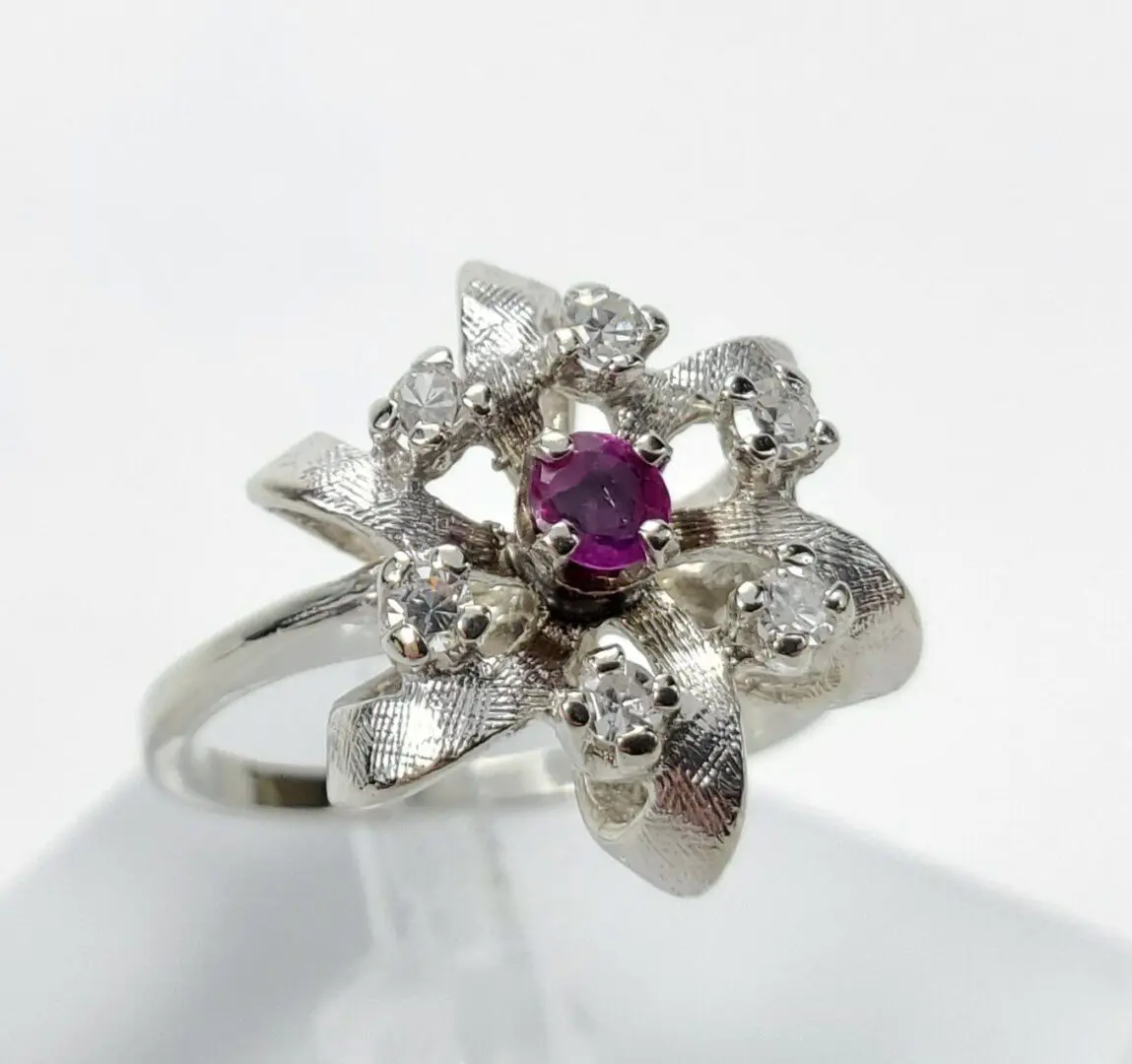 14k White Gold .25ctw Natural Ruby Diamond Textured Flower Florette Ring