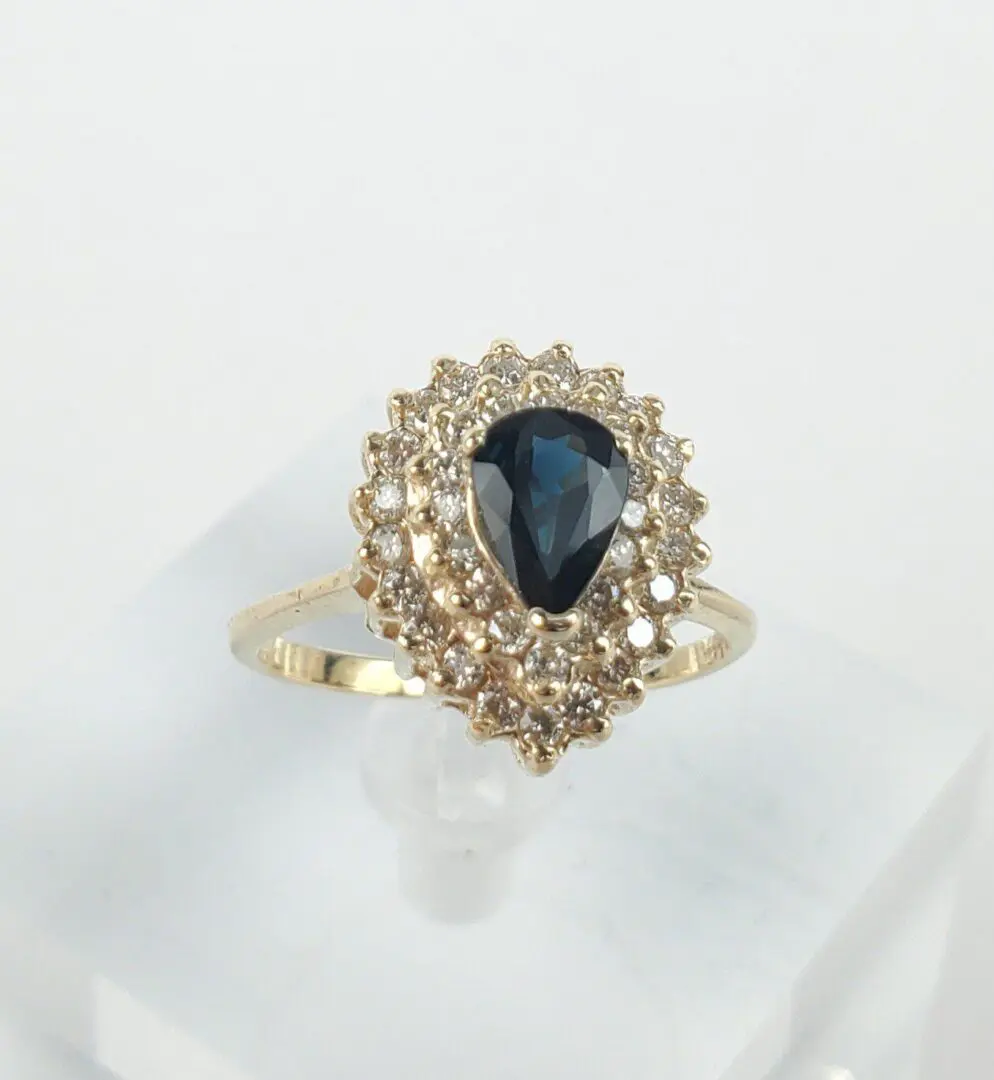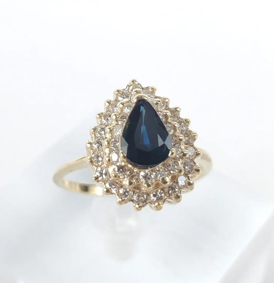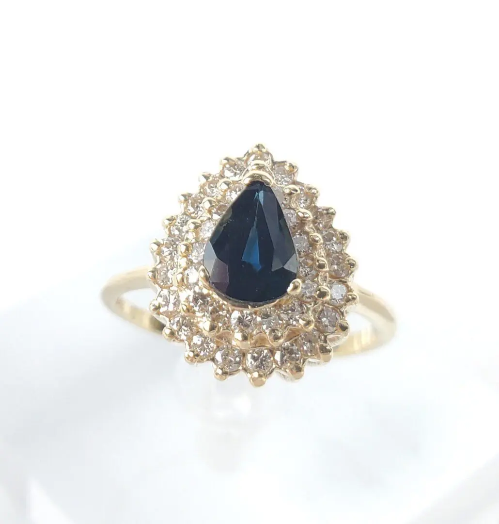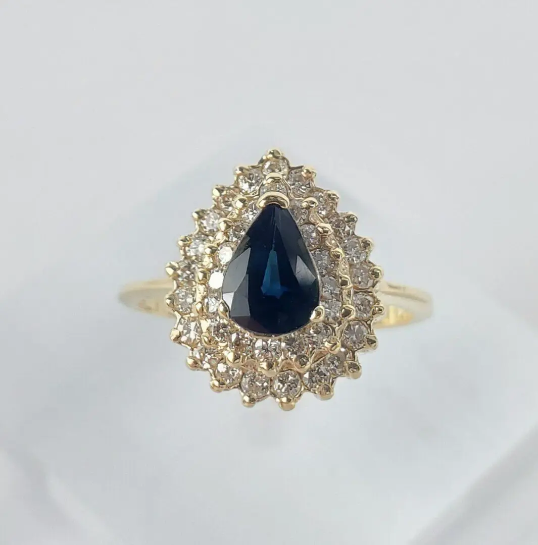 14k Yellow Gold 1.12ctw Pear Shape Blue Sapphire Diamond Double Halo Ring 6.75''