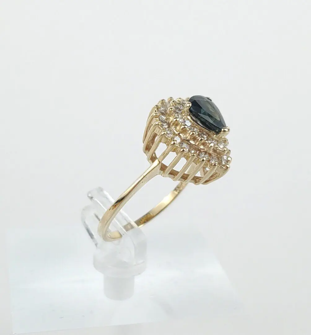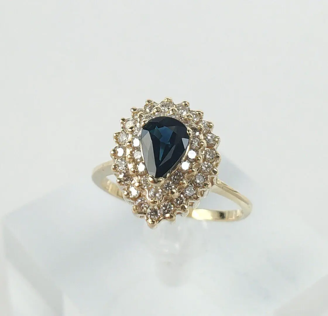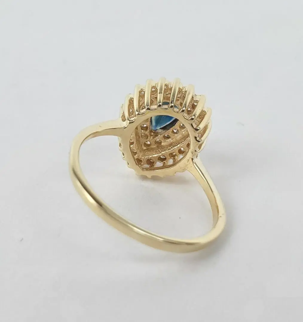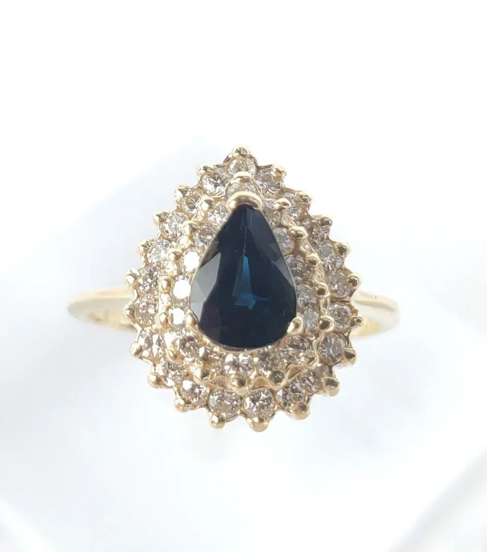 14k Yellow Gold 1.12ctw Pear Shape Blue Sapphire Diamond Double Halo Ring 6.75''