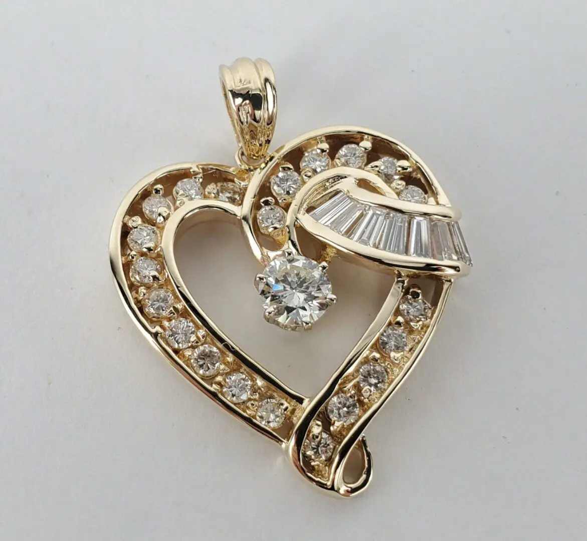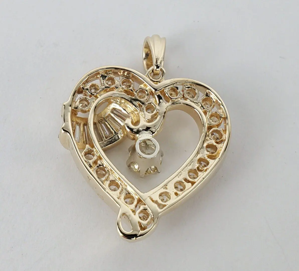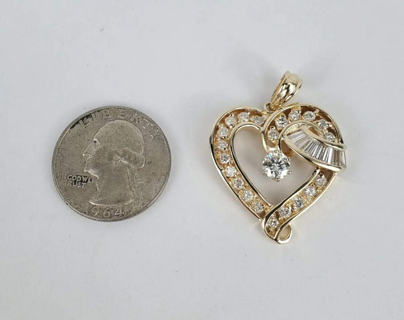 14k Yellow Gold 1.95ctw Round Baguette Diamond Large Heart Drop Pendant 1 3/8