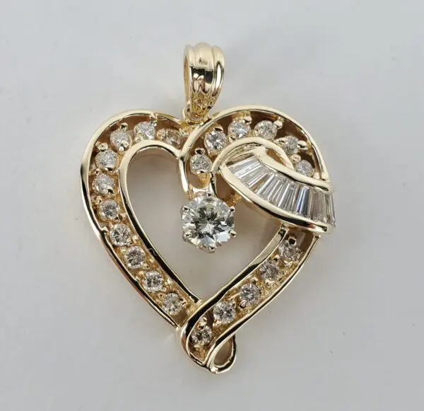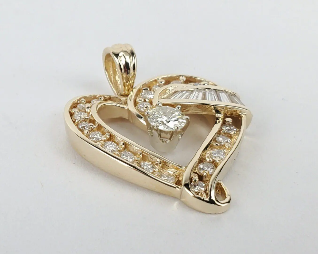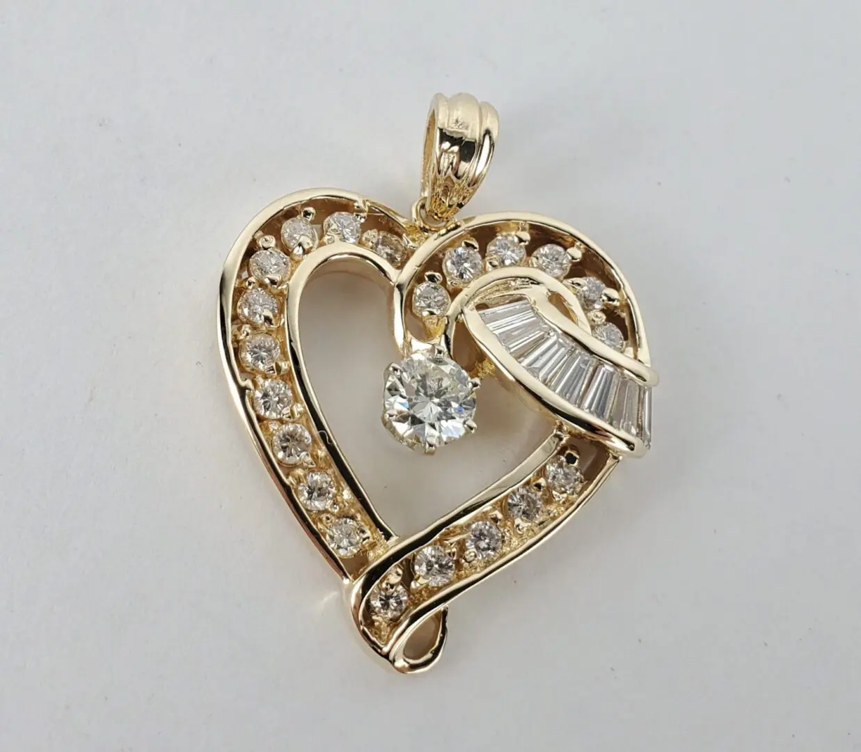 14k Yellow Gold 1.95ctw Round Baguette Diamond Large Heart Drop Pendant 1 3/8