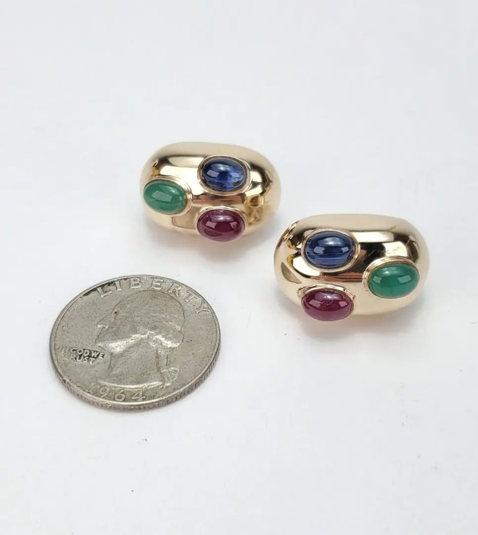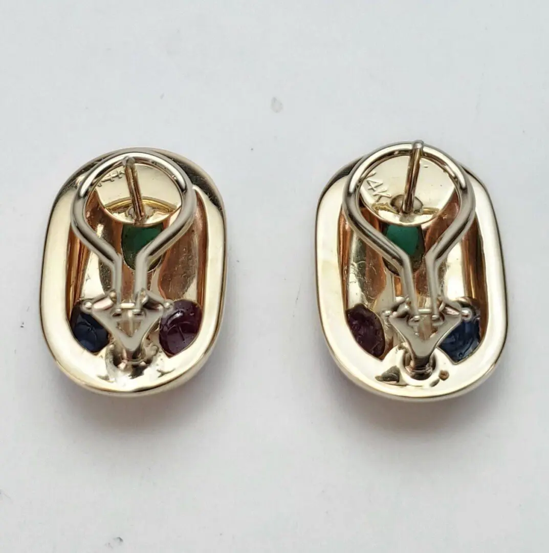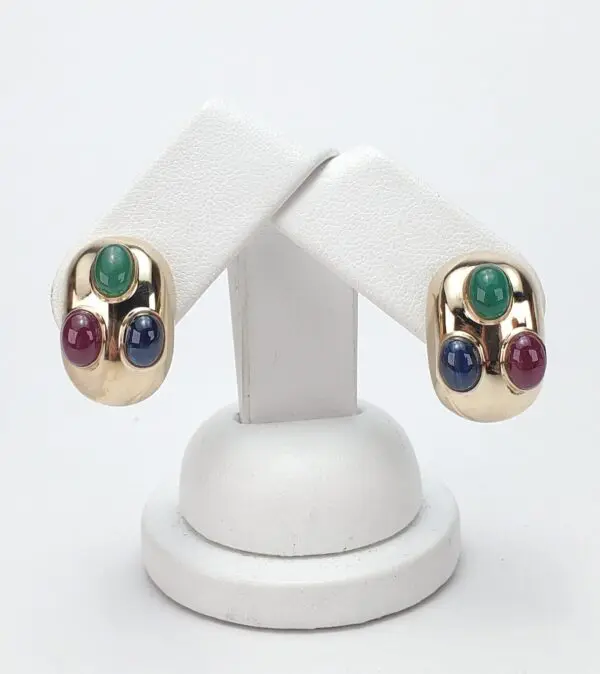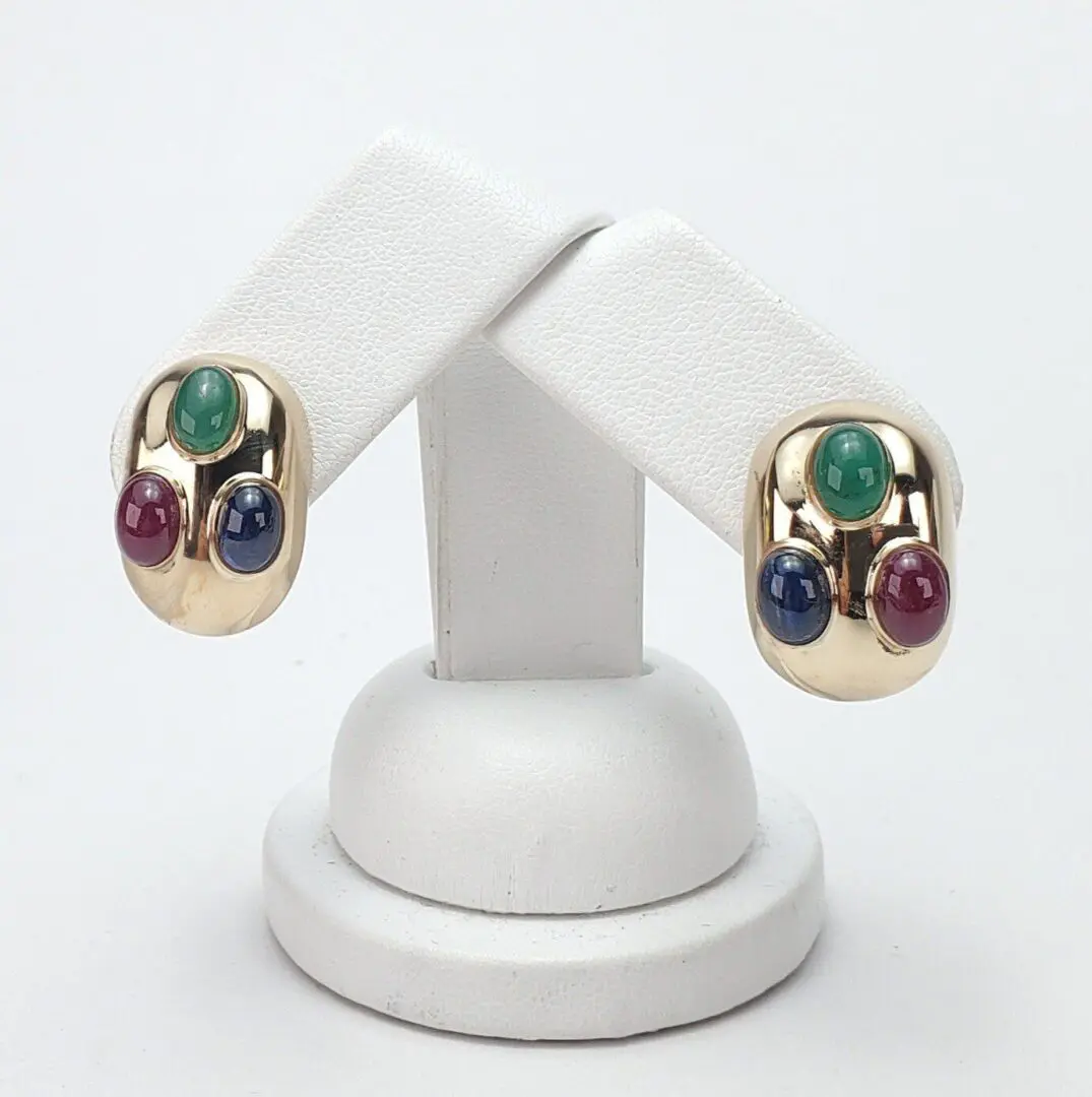 14k Yellow Gold Natural Oval Cabochon Emerald Ruby Blue Sapphire Omega Earrings