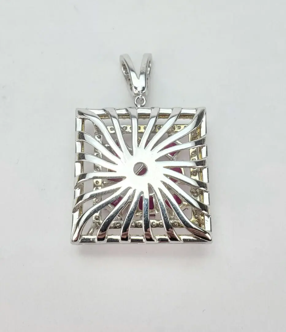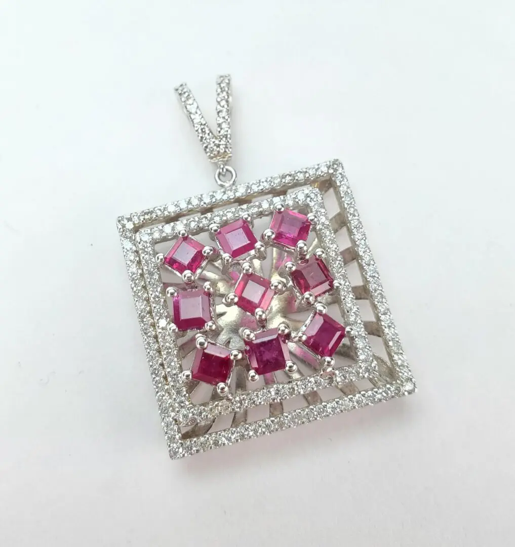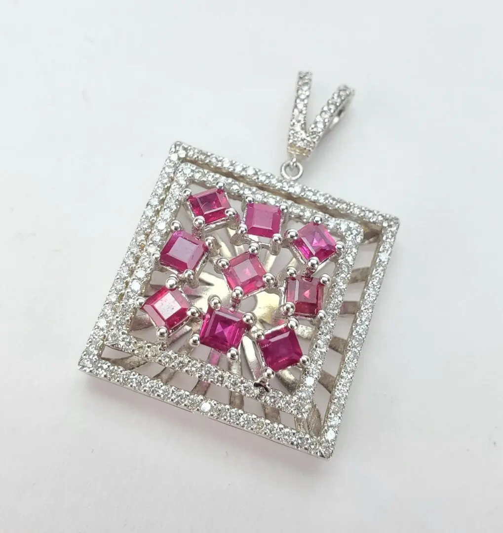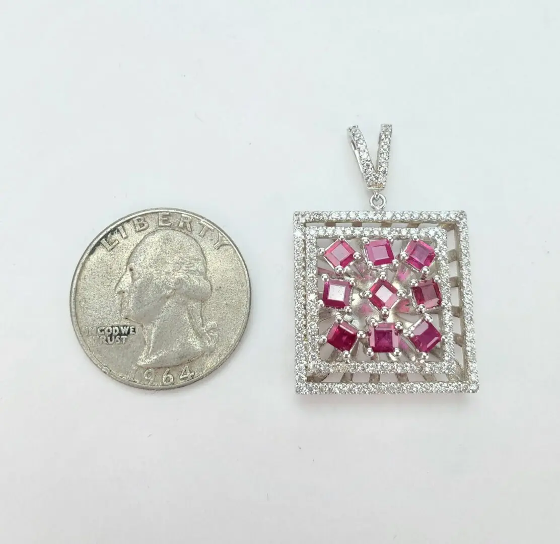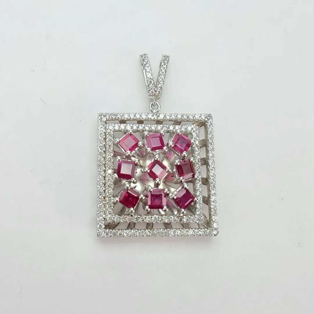 18k White Gold 2.44ctw Natural Ruby Diamond Unique Square Halo Drop Pendant