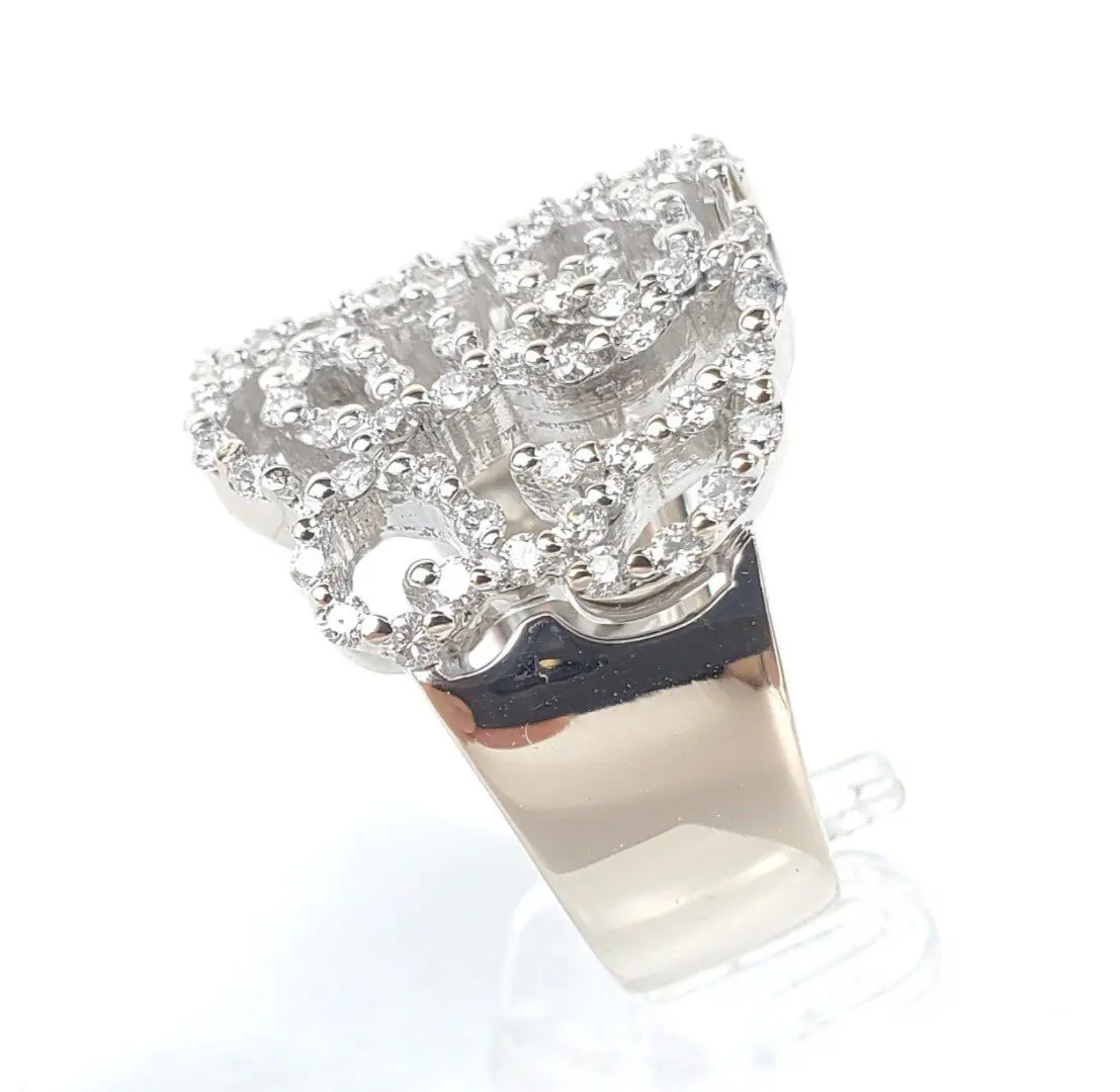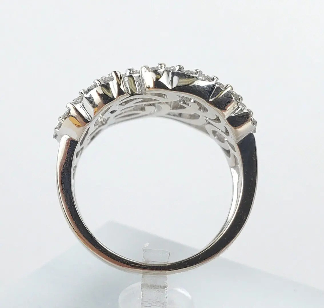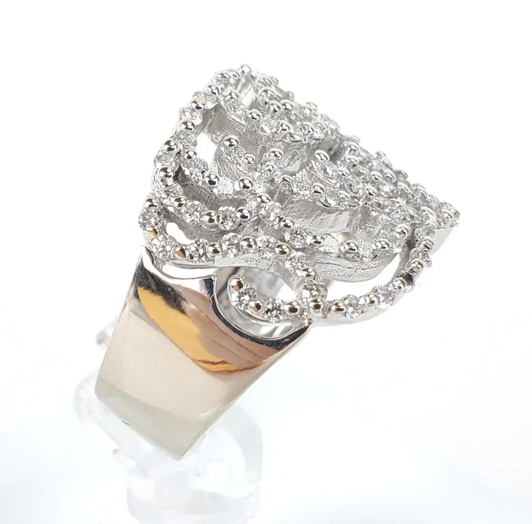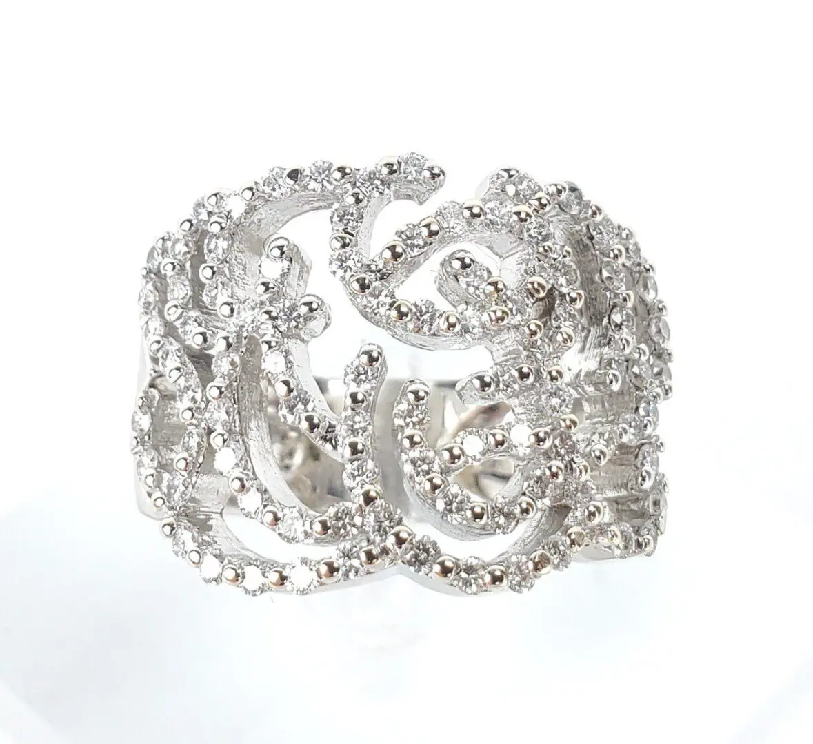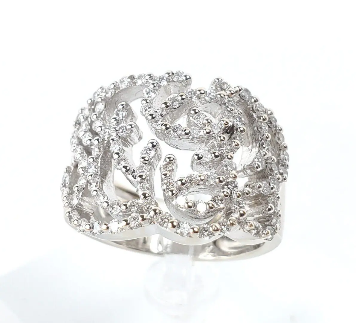 18k White Gold Pave Diamond Open Scroll Work Cluster Band Ring 7.5''