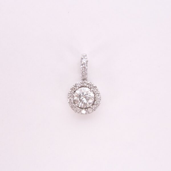 Add timeless sparkle to your jewelry collection with this stunning 18k white gold diamond pendant. Featuring a dazzling round brilliant cut diamond at the center, surrounded by a halo of sparkling pavé-set diamonds, this pendant captures light from every angle. The diamond-accented bail adds even more brilliance, making it the perfect statement piece for any occasion.