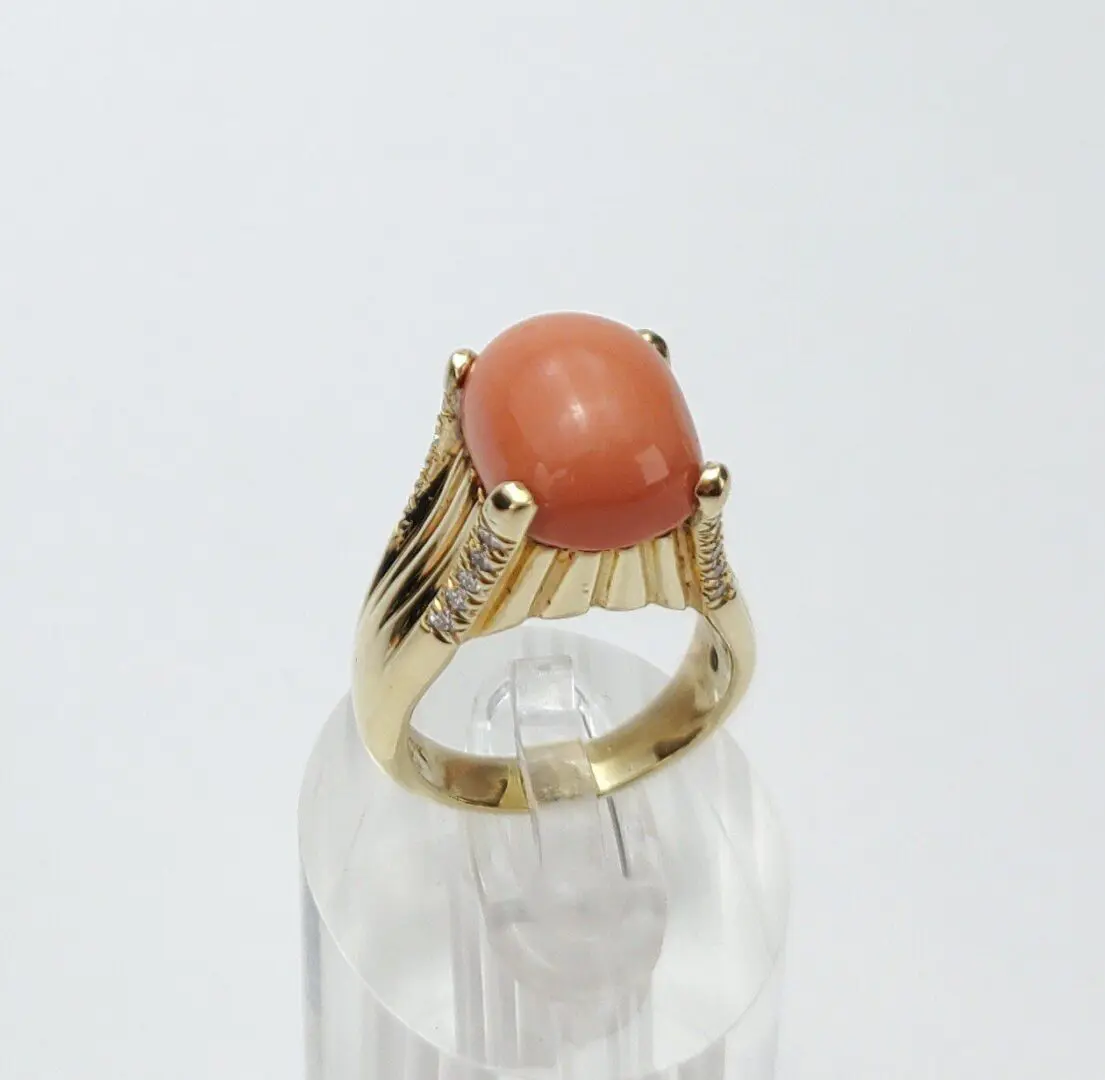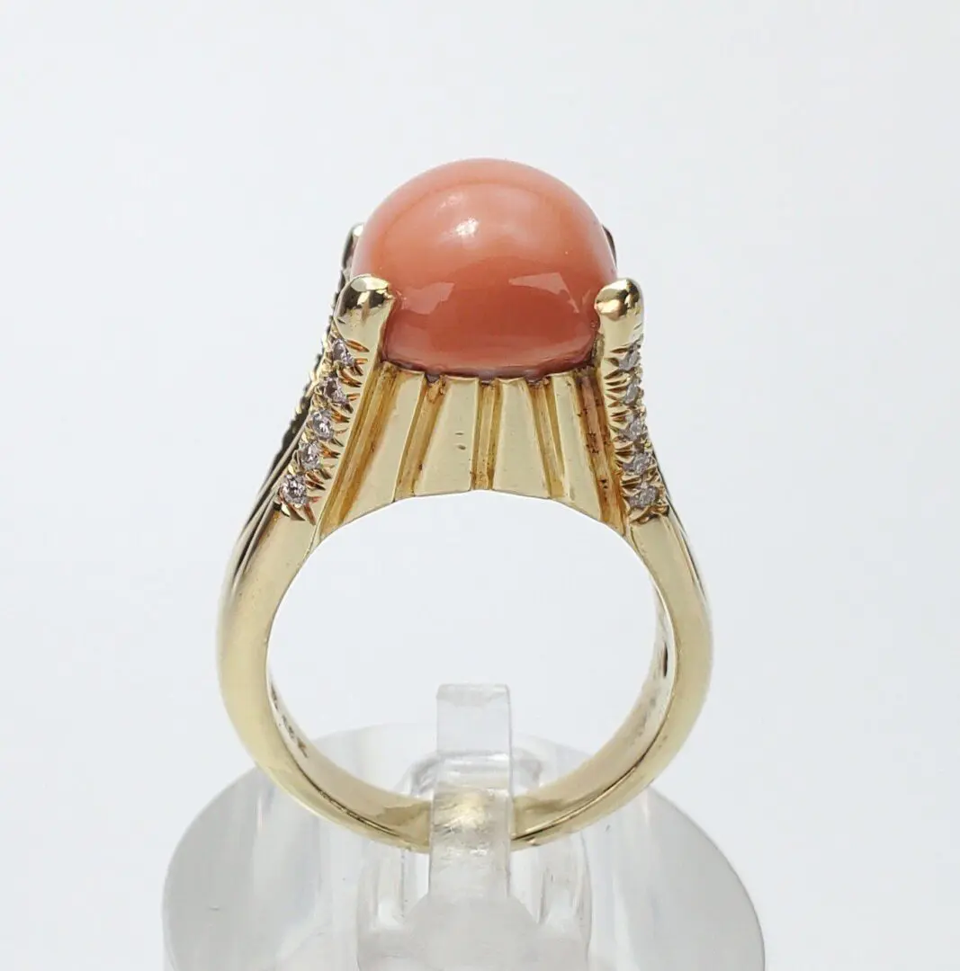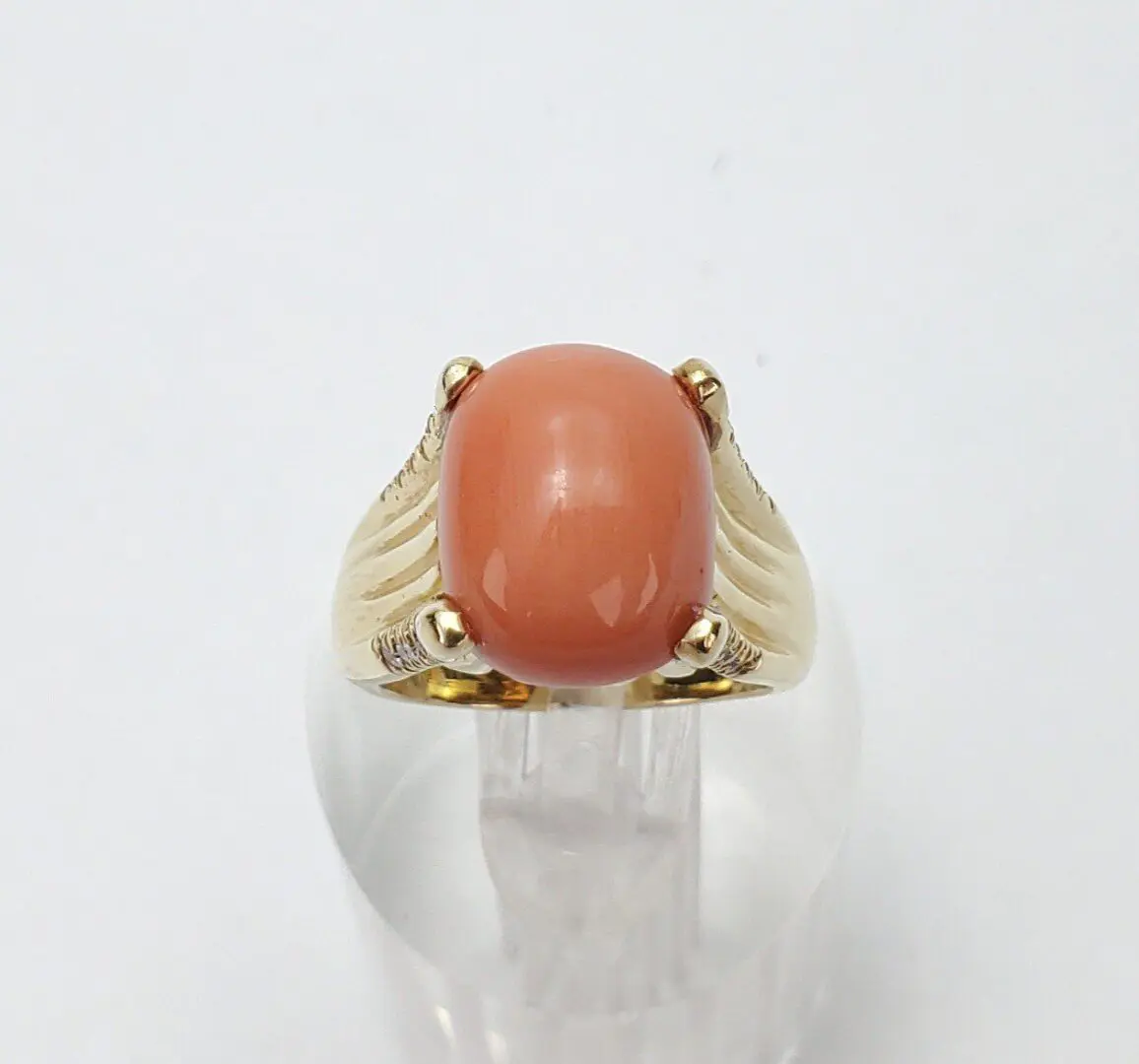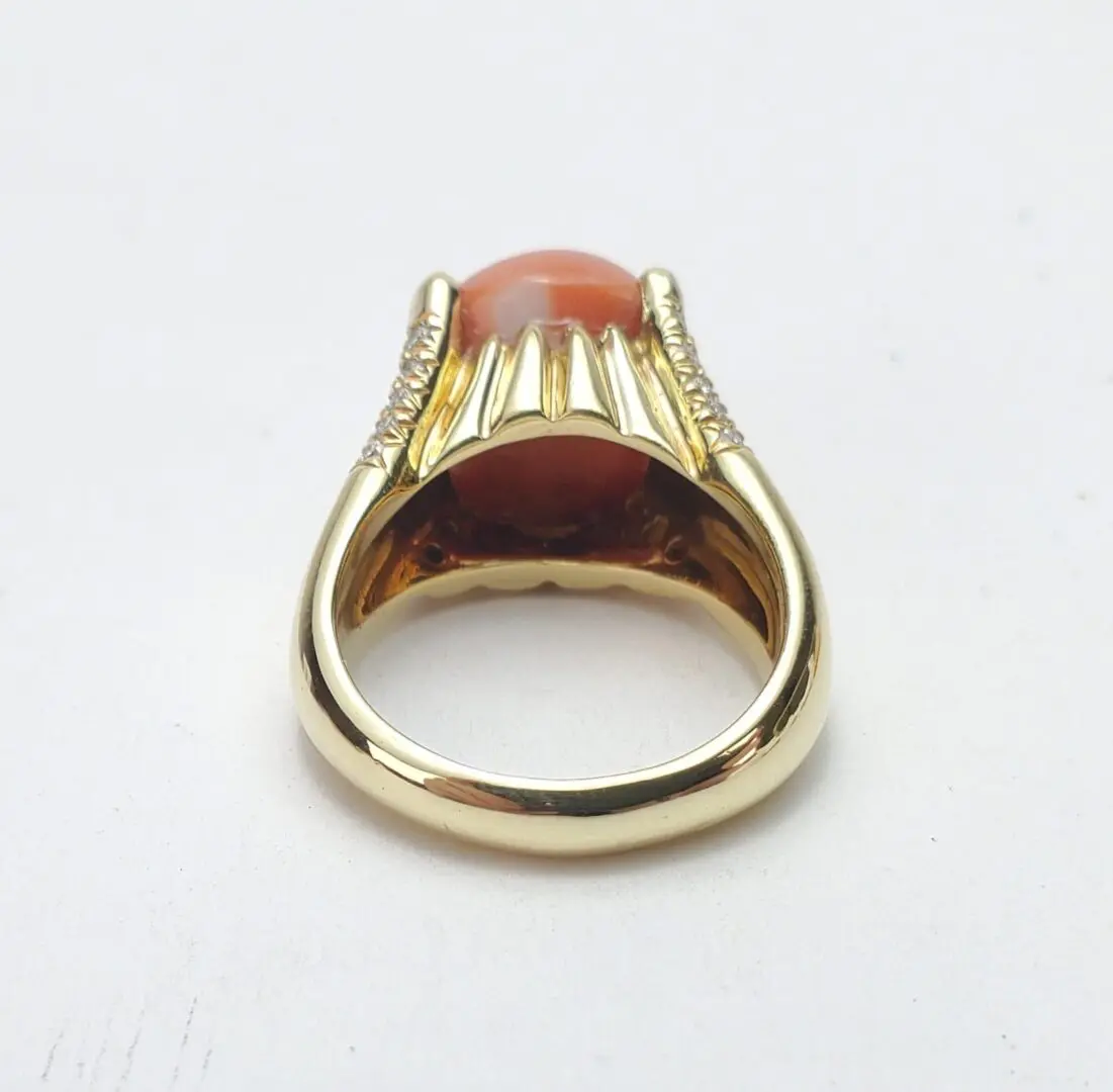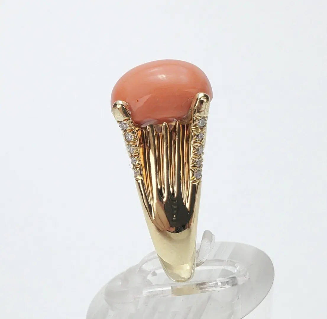 18k Yellow Gold Natural Diamond Coral Cocktail Estate Dinner Ring 5.5''