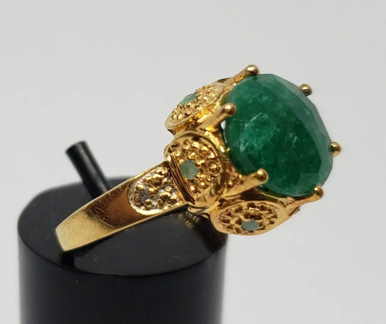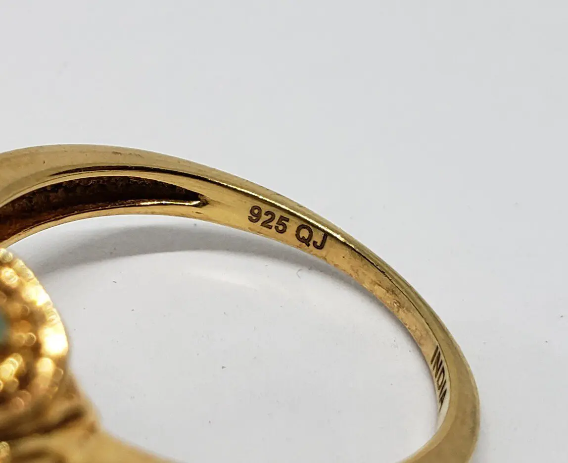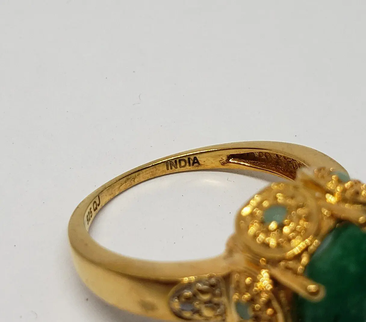 925 Sterling Silver Gold Tone Emerald Diamond Granulated Ring India 7.25''