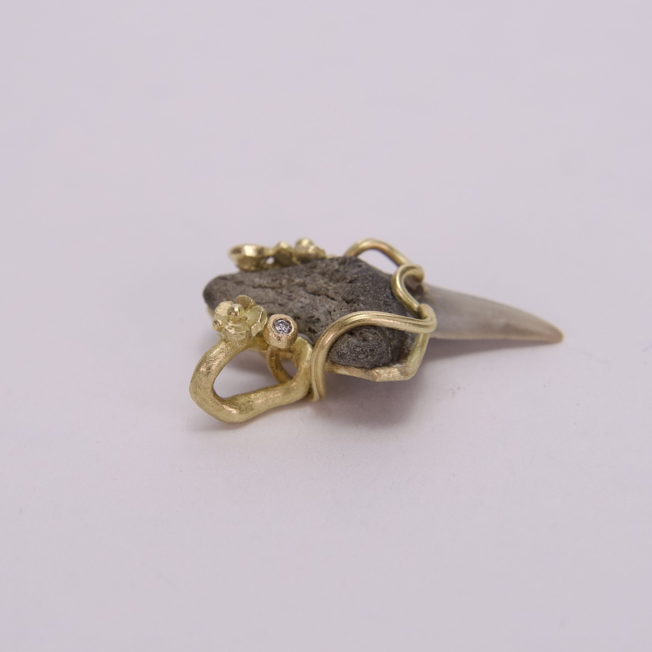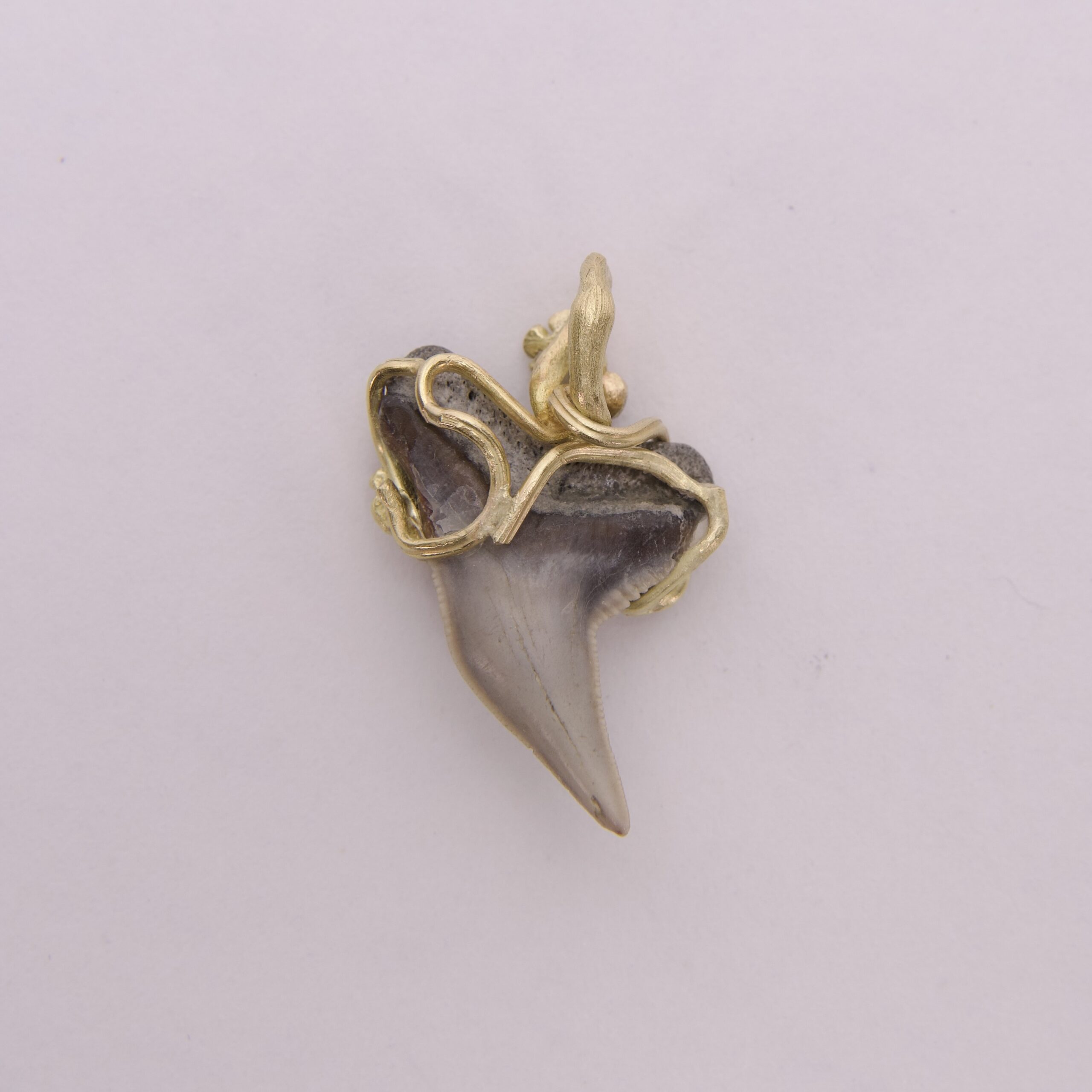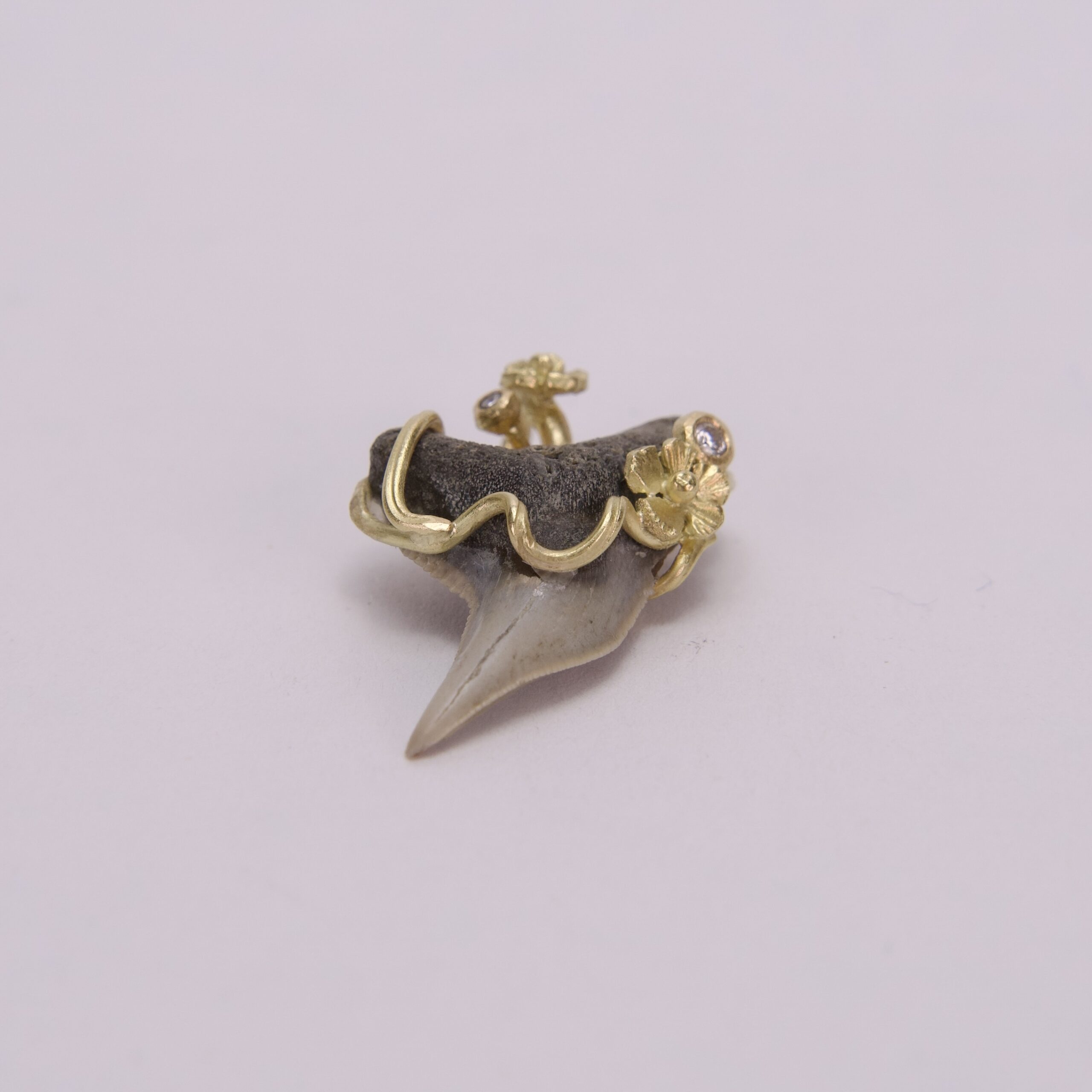Crafted from solid 18K yellow gold, the pendant features a genuine fossilized shark tooth encased in an intricately hand-wrapped gold wire adorned with floral engravings and bezel-set diamonds. The result is a one-of-a-kind wearable sculpture that balances raw natural form with refined luxury.