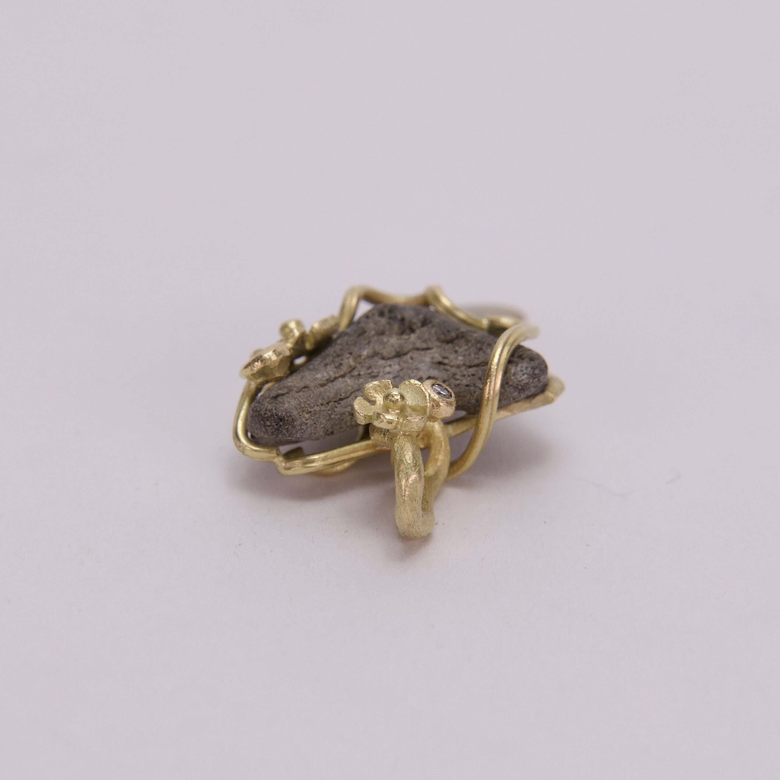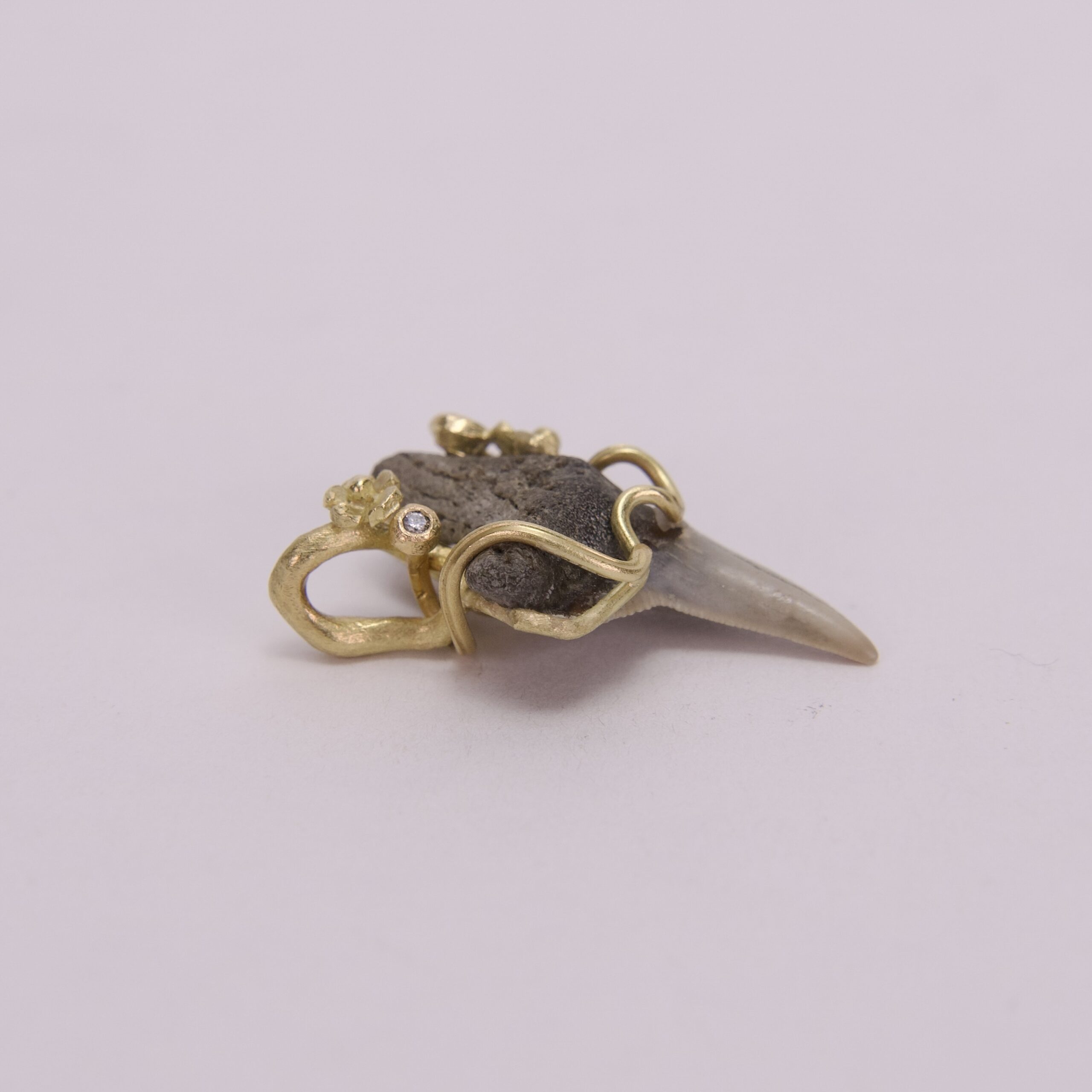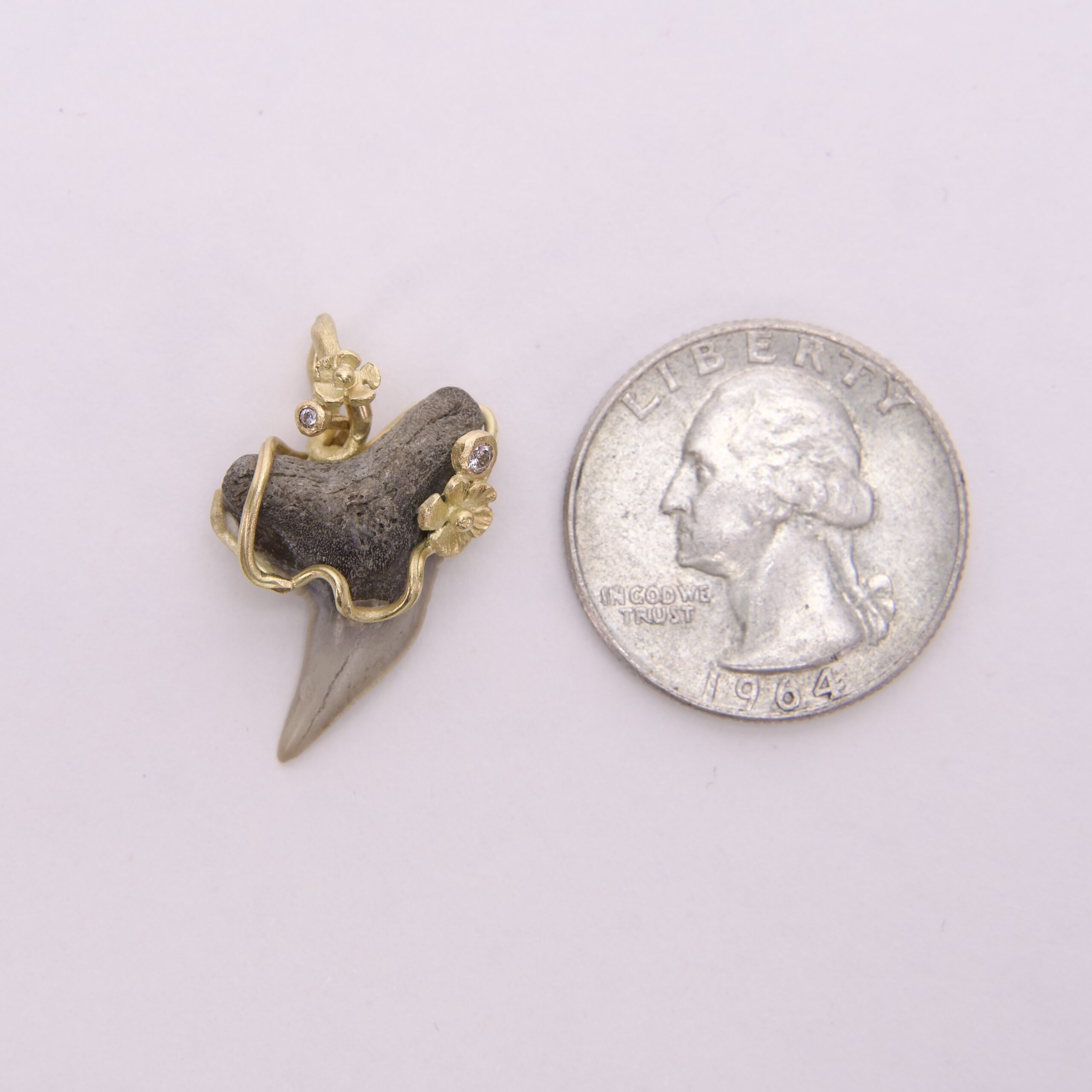Crafted from solid 18K yellow gold, the pendant features a genuine fossilized shark tooth encased in an intricately hand-wrapped gold wire adorned with floral engravings and bezel-set diamonds. The result is a one-of-a-kind wearable sculpture that balances raw natural form with refined luxury.