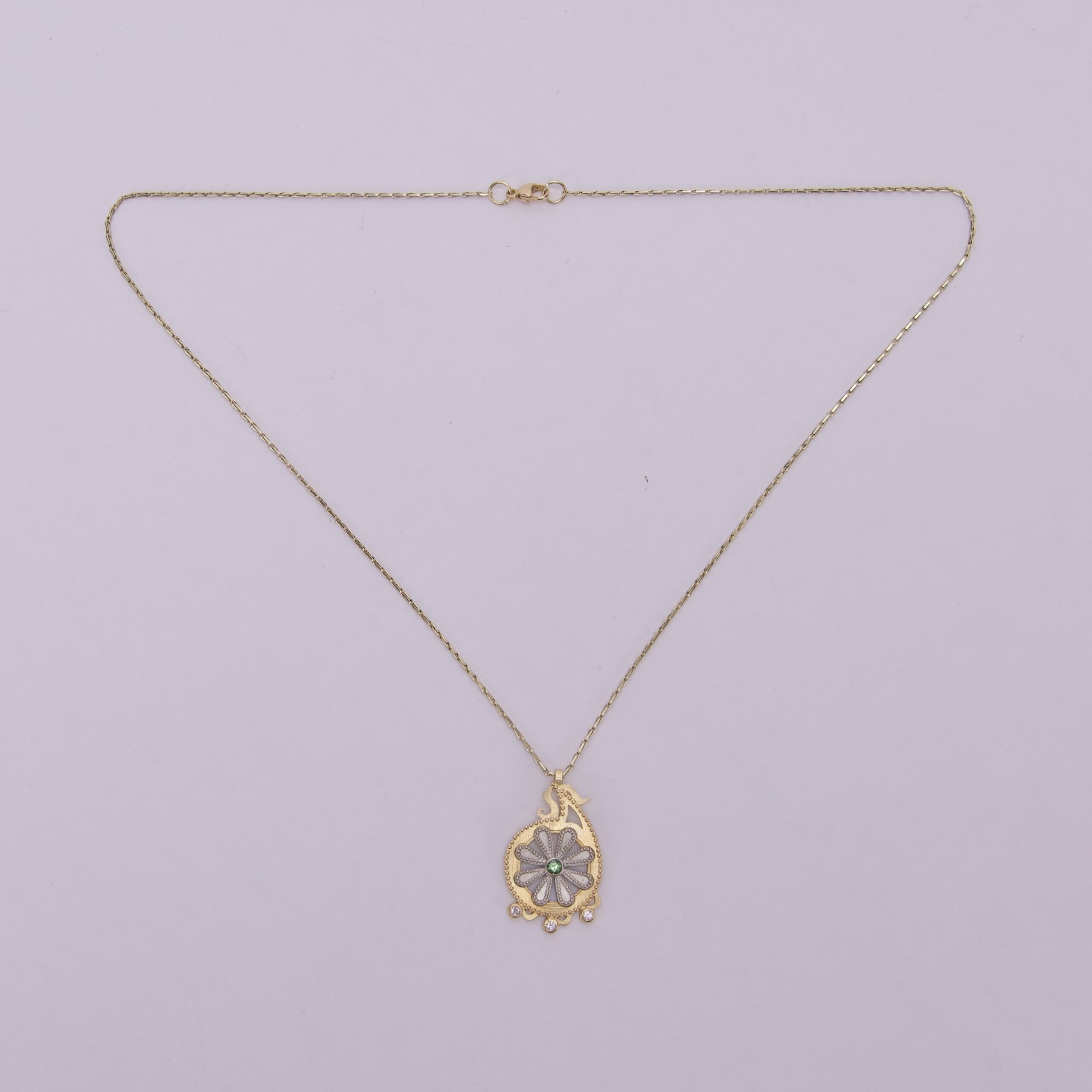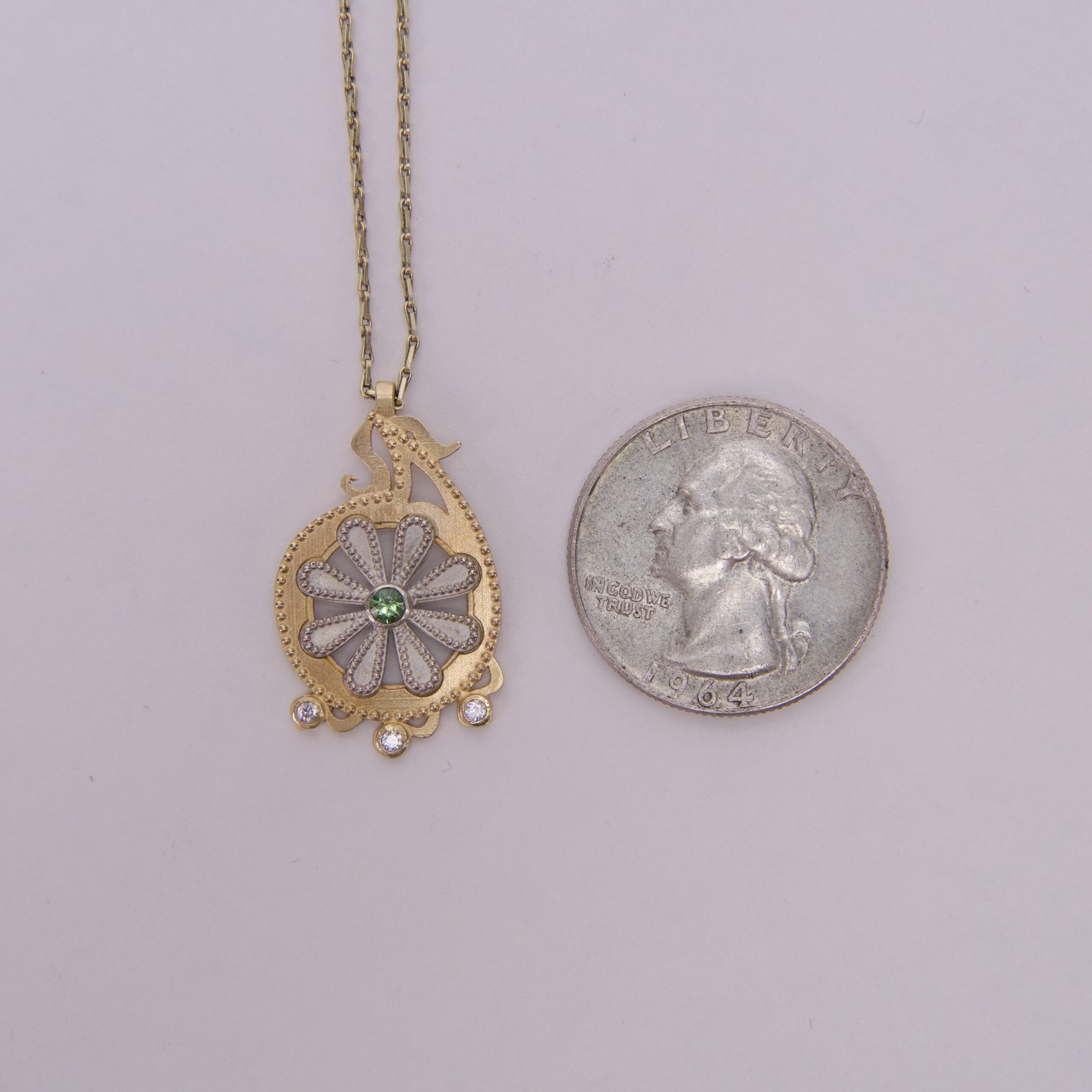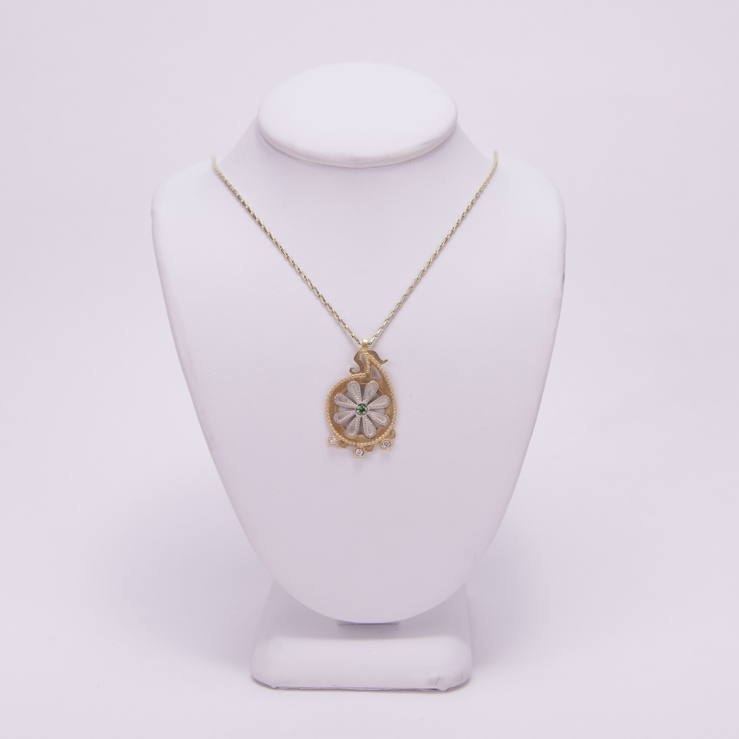 Delicately handcrafted, this Megan Thorne 18k Yellow Gold and 925 Sterling Silver Necklace embodies the designer’s signature blend of romantic elegance and timeless artistry. The pendant features an intricate floral motif, highlighted by a soft contrast between warm yellow gold and cool sterling silver. A green gemstone center and dainty diamond-accented drops add a touch of sparkle and sophistication to the design.