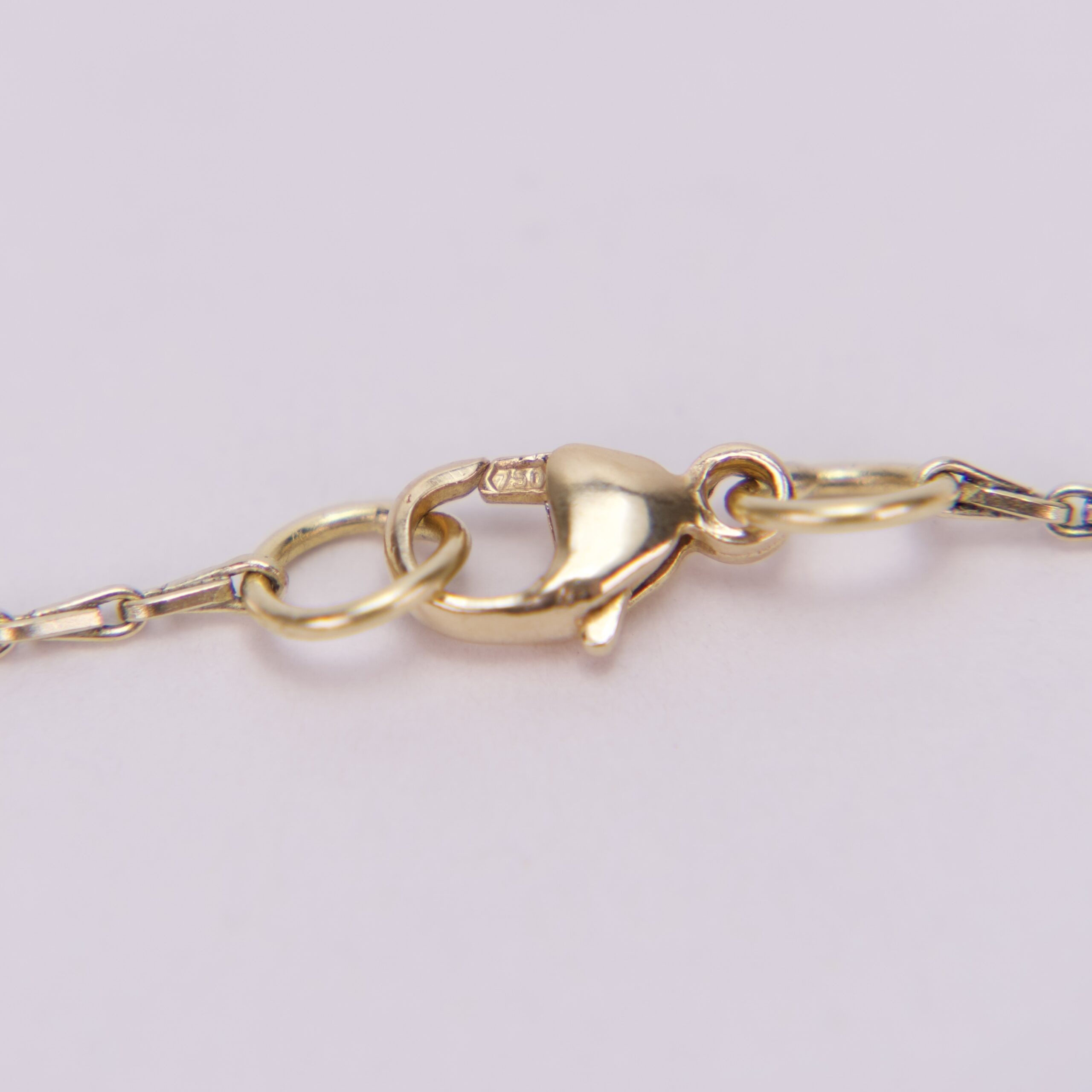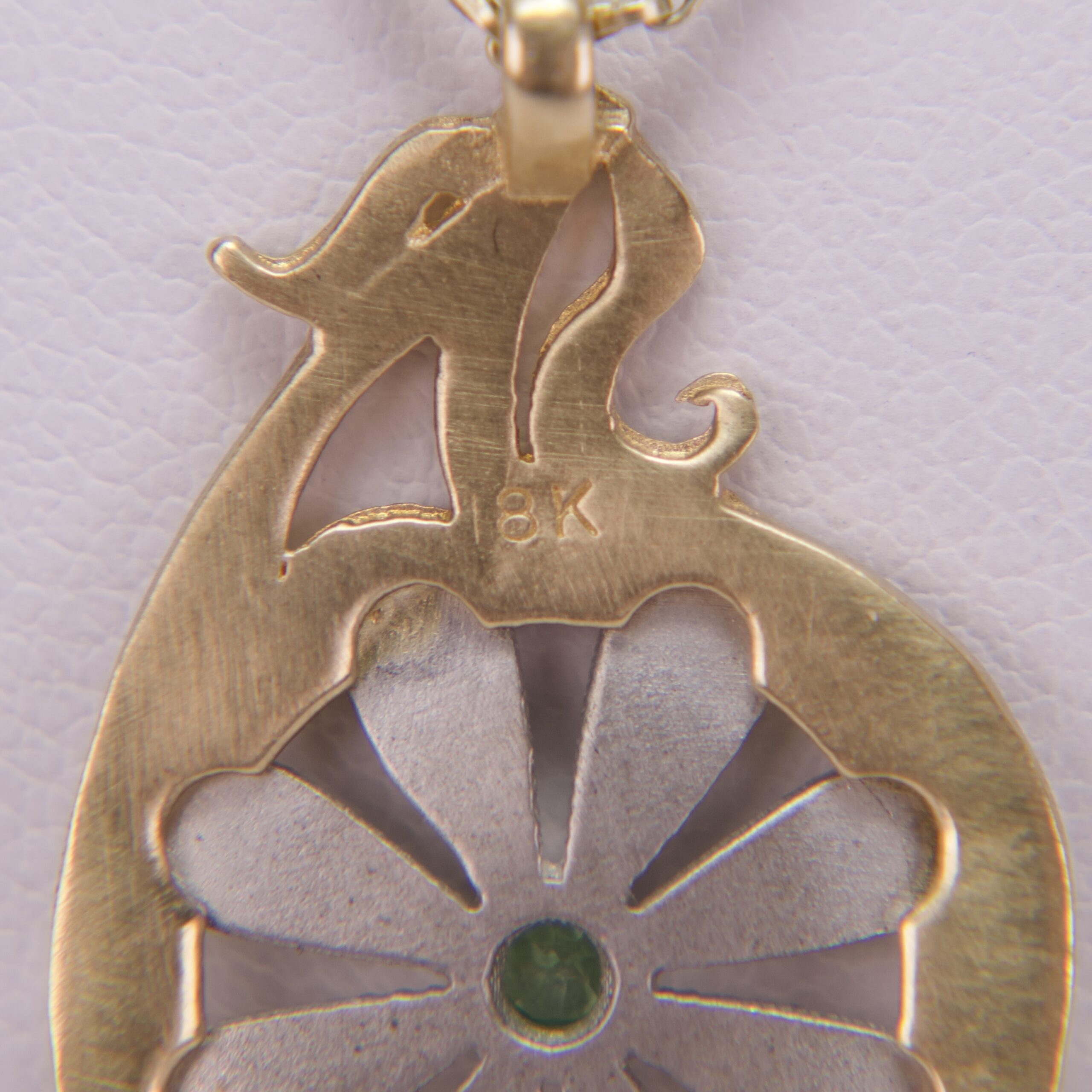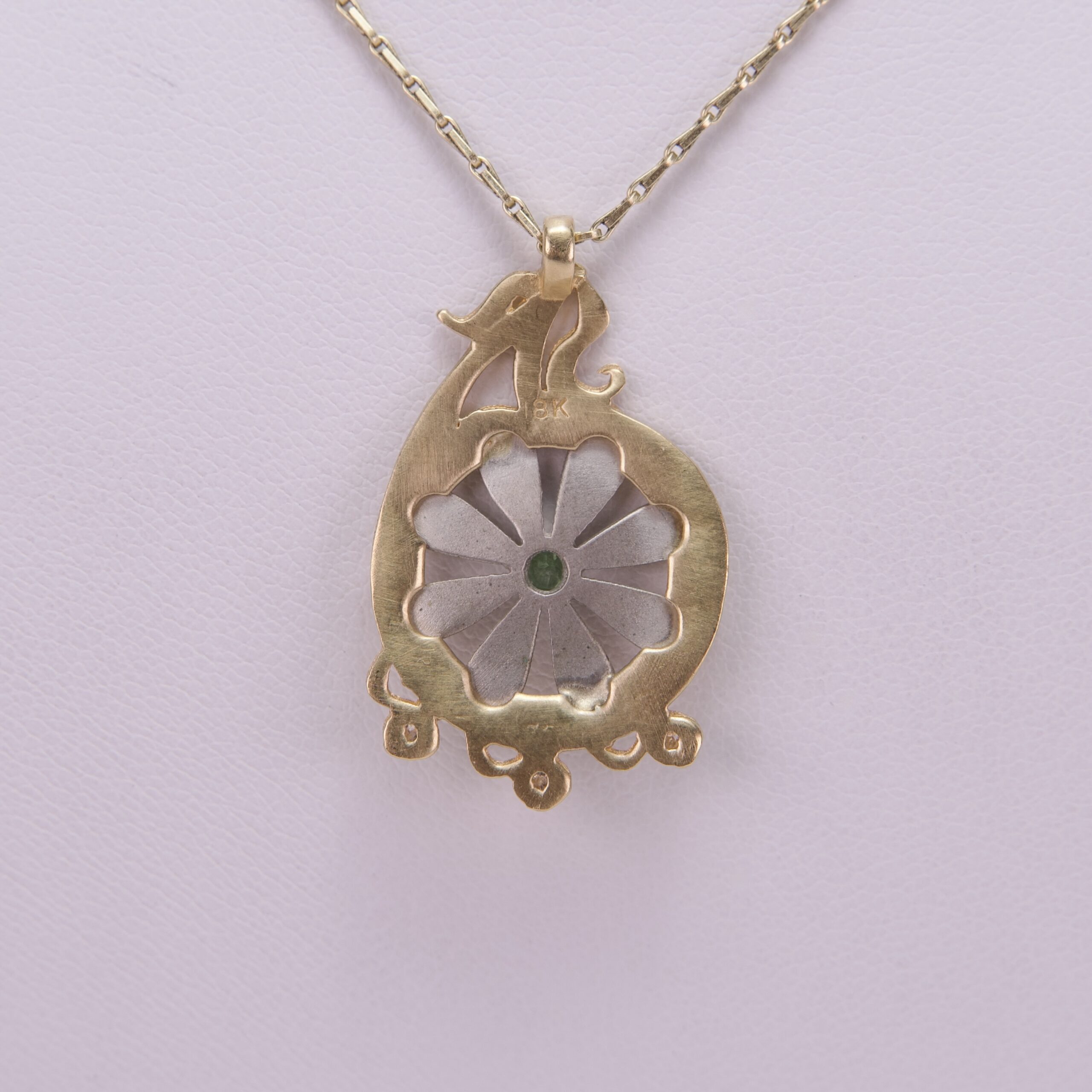 Delicately handcrafted, this Megan Thorne 18k Yellow Gold and 925 Sterling Silver Necklace embodies the designer’s signature blend of romantic elegance and timeless artistry. The pendant features an intricate floral motif, highlighted by a soft contrast between warm yellow gold and cool sterling silver. A green gemstone center and dainty diamond-accented drops add a touch of sparkle and sophistication to the design.