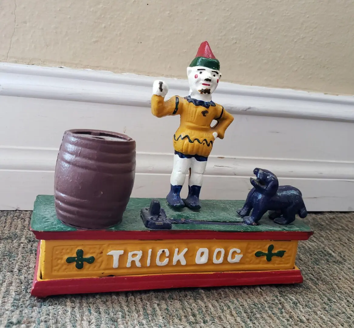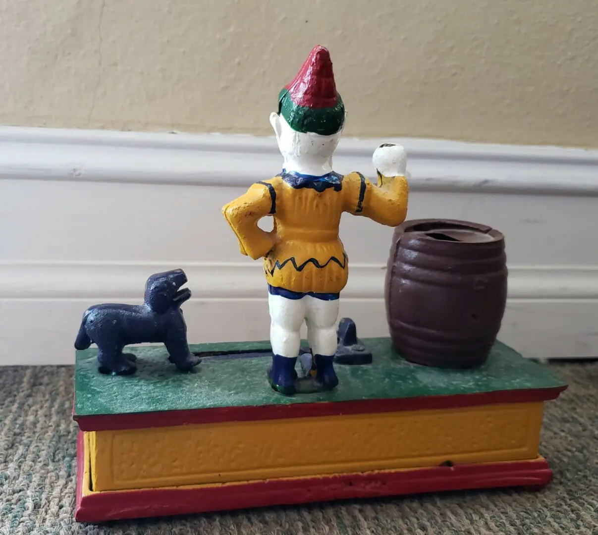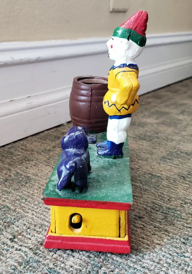 Vintage Cast Iron Mechanical Bank Clown & Trick Dog Hand Painted Works