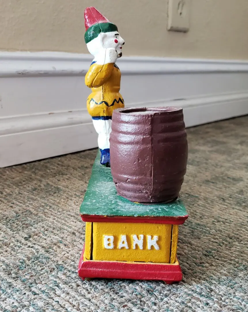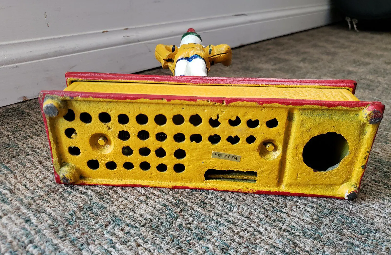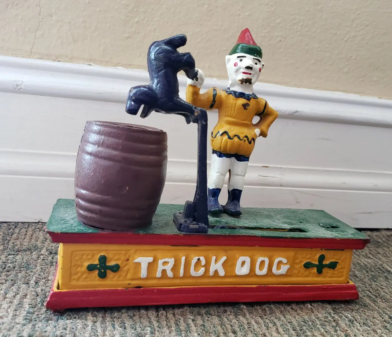 Vintage Cast Iron Mechanical Bank Clown & Trick Dog Hand Painted Works